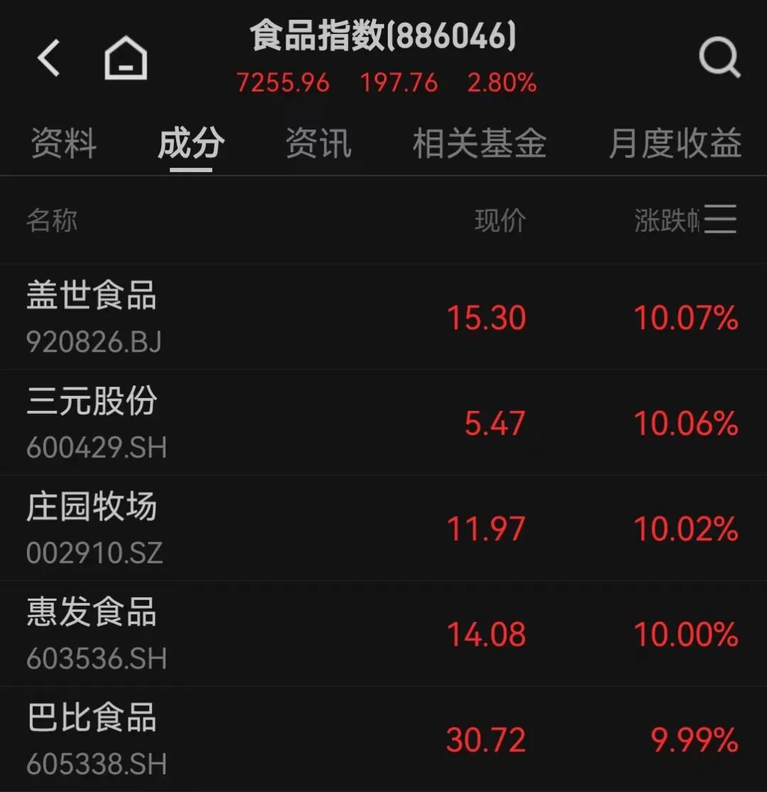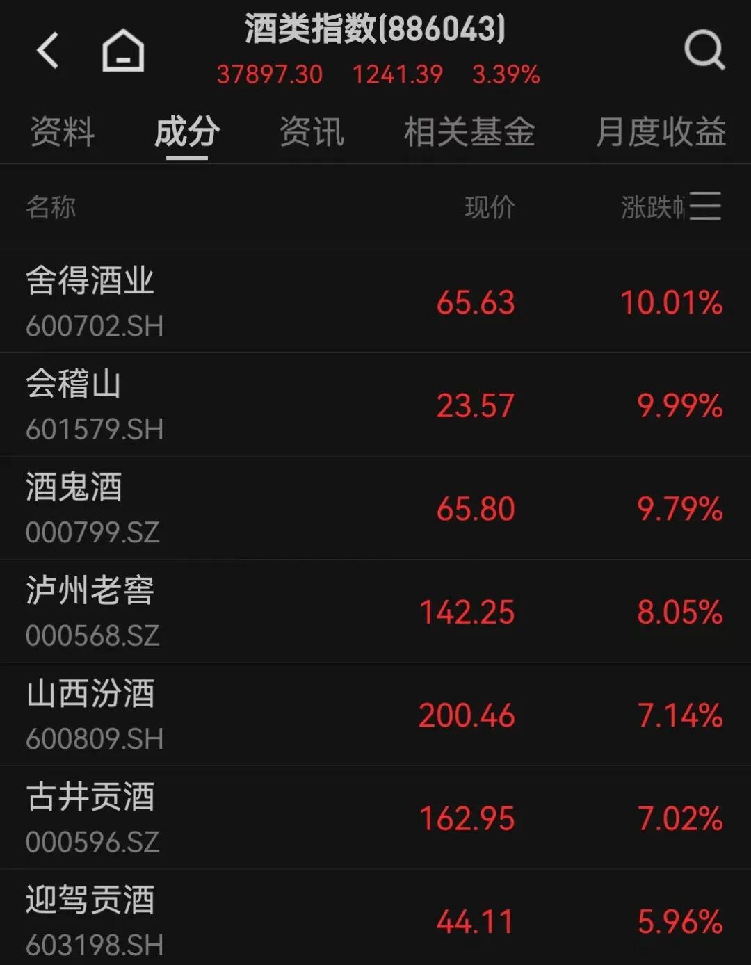 截至发稿,舍得酒业、会稽山、盖世食品、锦江酒店、欢乐家、三元股份、惠发食品等多股涨停。