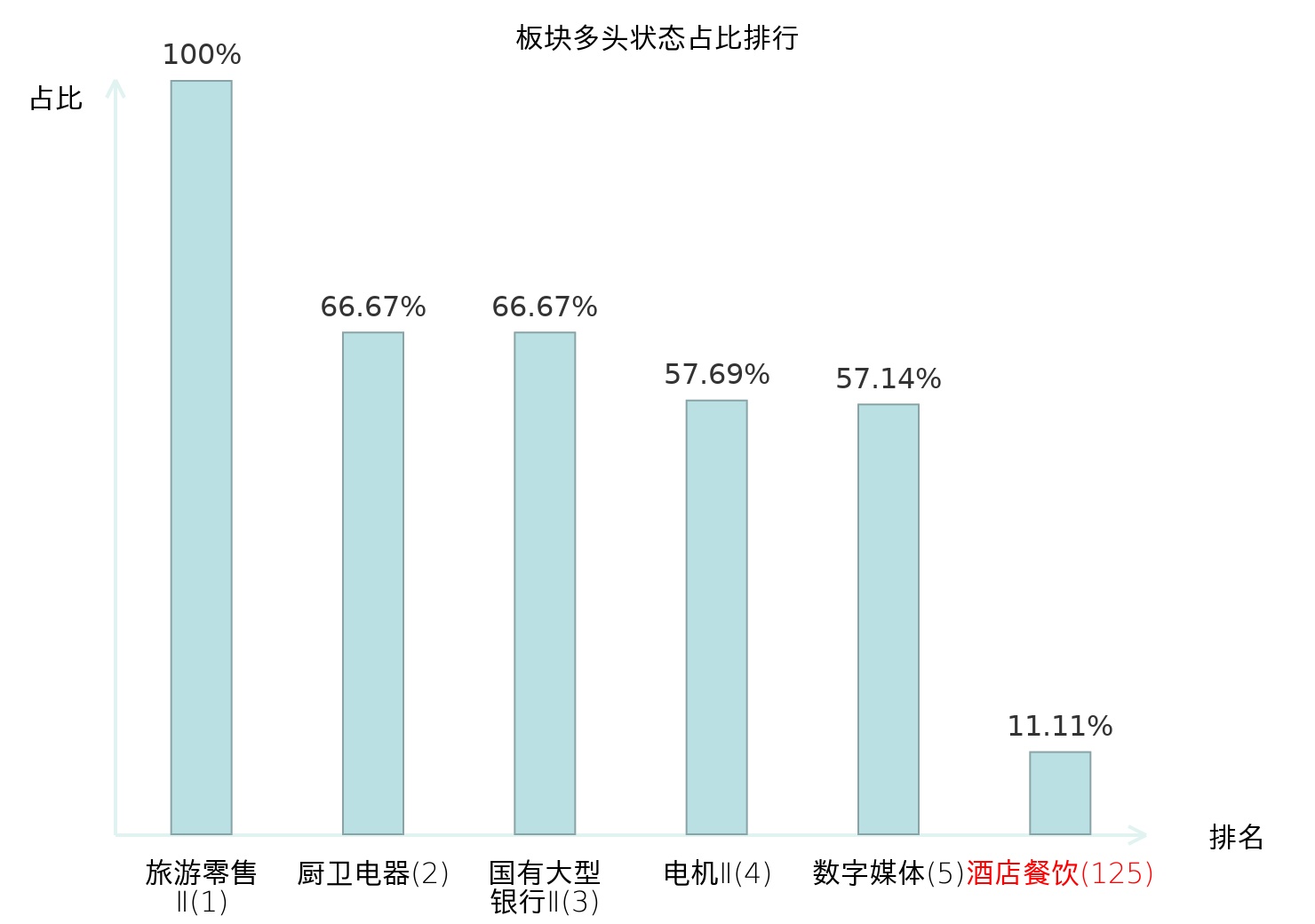 全市场所有行业板块中主力多头状态占比排名中,旅游零售Ⅱ板块位居第一。汽车服务板块名次提升最快,较昨日上升70位。