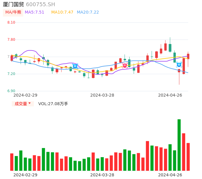 04月26日,厦门国贸收报7.55,股价涨幅1.07%,成交金额2.02亿元,换手率1.33%。