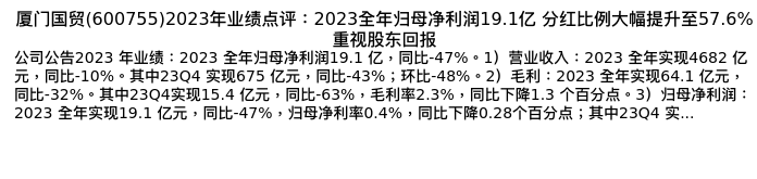 值得注意的是:2024年04月华创证券的吴一凡/吴晨玥/黄文鹤/梁婉怡分析师,首次发布关于厦门国贸的研究报告,标题为:厦门国贸(600755)2023年业绩点评:2023全年归母净利润19.1亿 分红比例大幅提升至57.6% 重视股东回报。