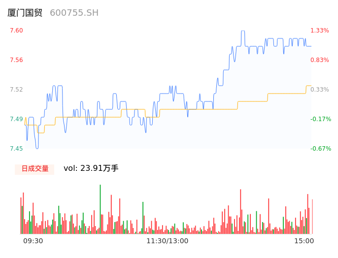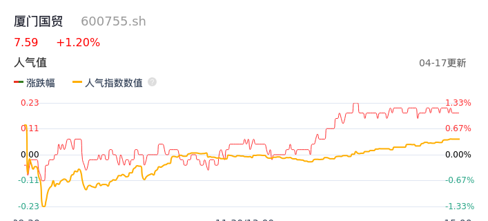 04月17日,厦门国贸收报7.59,股价涨幅1.20%,成交金额1.80亿元,换手率1.18%。