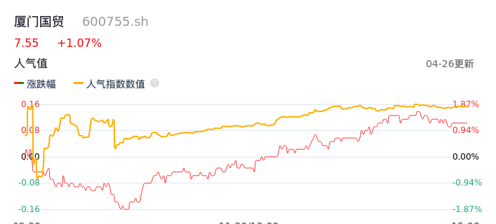 04月26日,厦门国贸收报7.55,股价涨幅1.07%,成交金额2.02亿元,换手率1.33%。