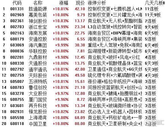 高位股方面,胜通能源11连板,嘉美包装11天9板,神剑股份7连板,海南自贸概念股安通控股5连板、海南发展6天5板,海汽集团、华联控股6天4板,九鼎新材4连板。