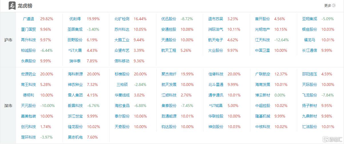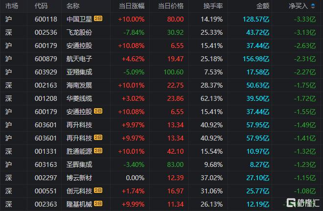 龙虎榜单日净卖出额前三为飞龙股份、安通控股、航天电子,分别为3.13亿元、2.63亿元、2.31亿元。