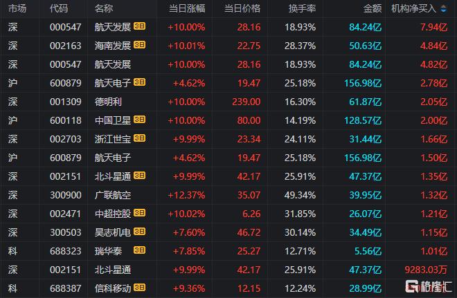 龙虎榜中涉及机构专用席位的个股中,当日净买入额前三为航天发展、德明利、航天电子,分别为4.82亿元、2.05亿元、1.50亿元。