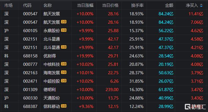 龙虎榜单日净买入额前三为航天发展、北斗星通、德明利,分别为11.41亿元、4.58亿元、3.47亿元。