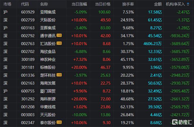 龙虎榜中涉及机构专用席位的个股中,当日净卖出额前三为亚翔集成、天际股份、圣晖集成,分别为2.47亿元、1.37亿元、1.28亿元。