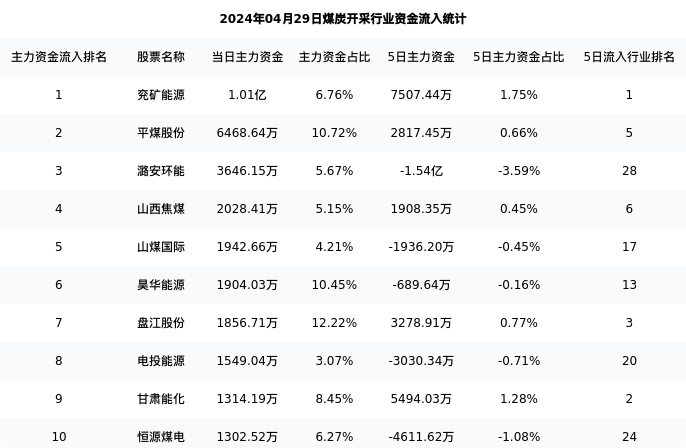 从主力资金流向来看,煤炭开采行业今日主力资金流入41.99亿元,在所有申万二级行业中排名:125/131。