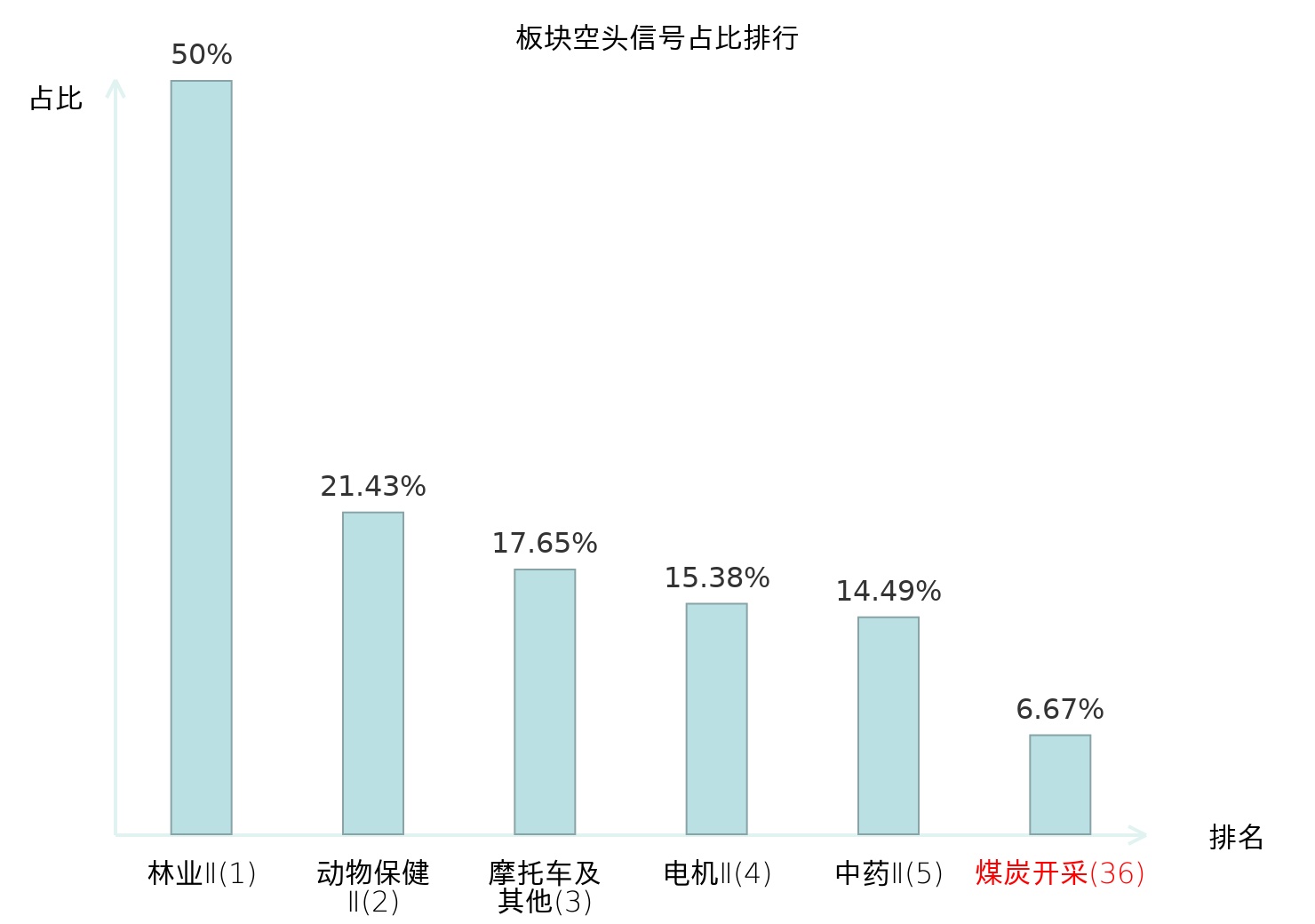 全市场所有行业板块中主力空头信号占比排名中,林业Ⅱ板块位居第一。动物保健Ⅱ板块名次提升最快,较昨日上升109位。