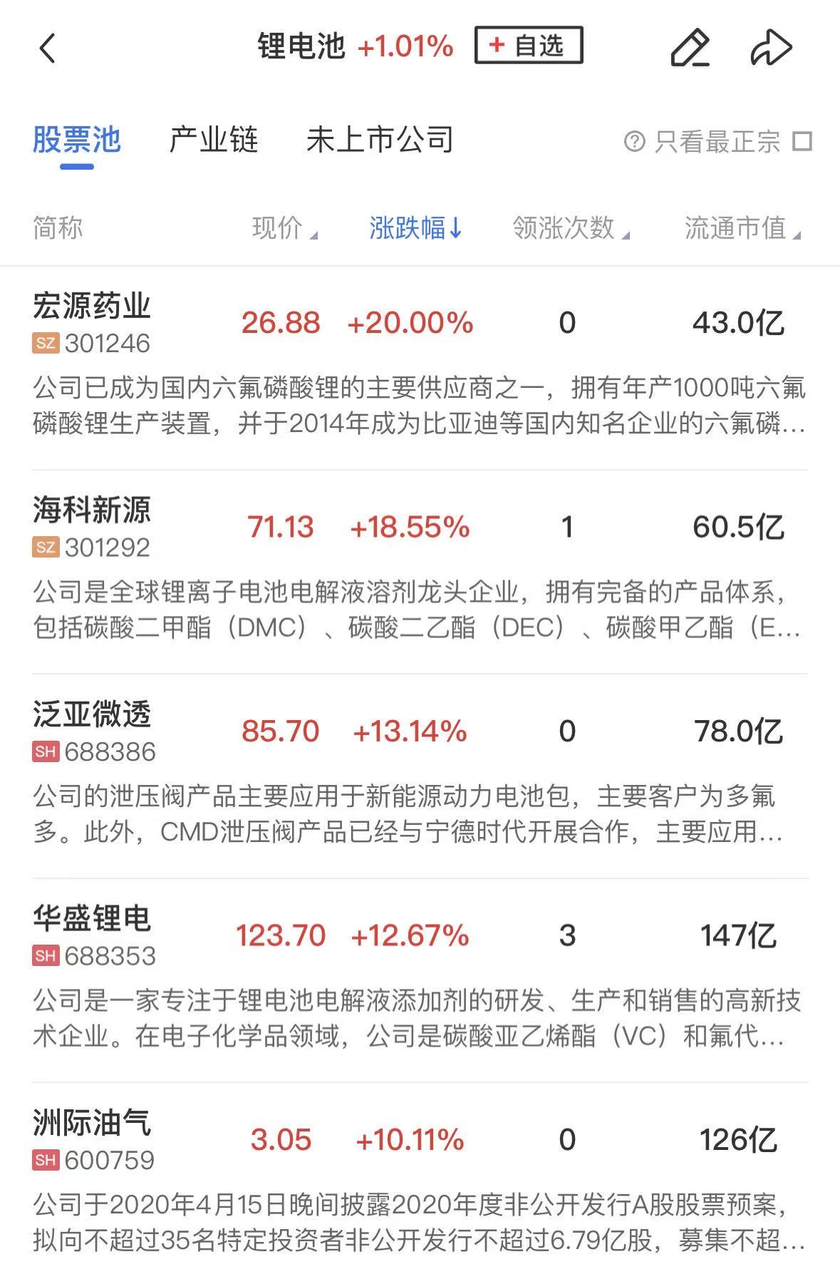 板块上,锂电产业链走强,天际股份4天3板,宏源药业、丰元股份、永兴材料等多股涨停,海科新源、华盛锂电、恩捷股份、万润新能等涨幅居前。