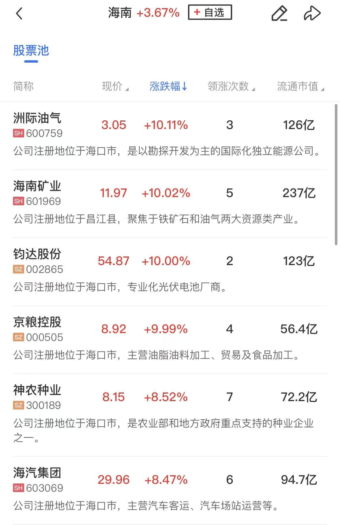 海南自贸概念股再度活跃,海南矿业、海南发展、钧达股份、京粮控股、洲际油气等涨停