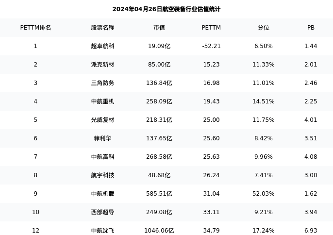 从估值角度看:中航沈飞最新市盈率PETTM为34.79,在行业内排名11/44,处于17.24分位。