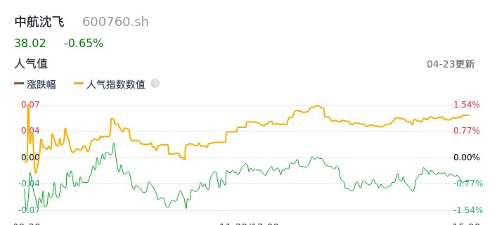 04月23日,中航沈飞收报38.02,股价涨幅-0.65%,成交金额5.97亿元,换手率0.57%。