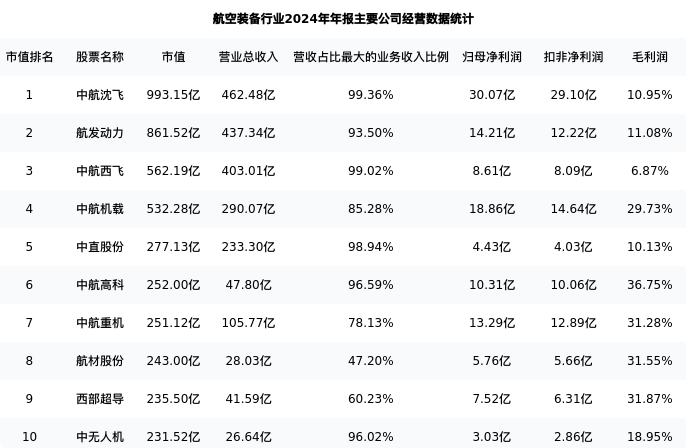 中航沈飞最新报告期数据为年报,下表汇总了航空装备行业内市值靠前的公司年报主要经营数据