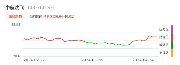 我们来看一下该股的九方特色指标强弱趋势的情况:中航沈飞自04月19日从观望区上穿到持仓区。股价近期在多头区域持续强势上扬,上升动能仍较为充足,可积极关注。后续重点关注上方压力位:40.01元是否能突破上攻。