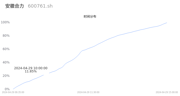 首先我们来看当日成交的时间分布。将今日交易时间按照5分钟的时间间隔进行切片,并绘制分布直方图进行观察。可以发现,10点之前的成交量占全天成交量的11.85%,这说明,该股票活跃时段换手率一般,资金热度较一般。