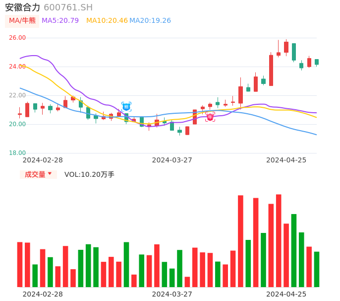 04月25日,安徽合力收报24.14,股价涨幅-1.75%,成交金额2.46亿元,换手率1.30%。