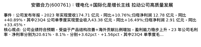 值得注意的是:2024年04月长城证券的何文雯分析师,首次发布关于安徽合力的研究报告,标题为:安徽合力(600761):锂电化+国际化是增长主线 拉动公司高质量发展。