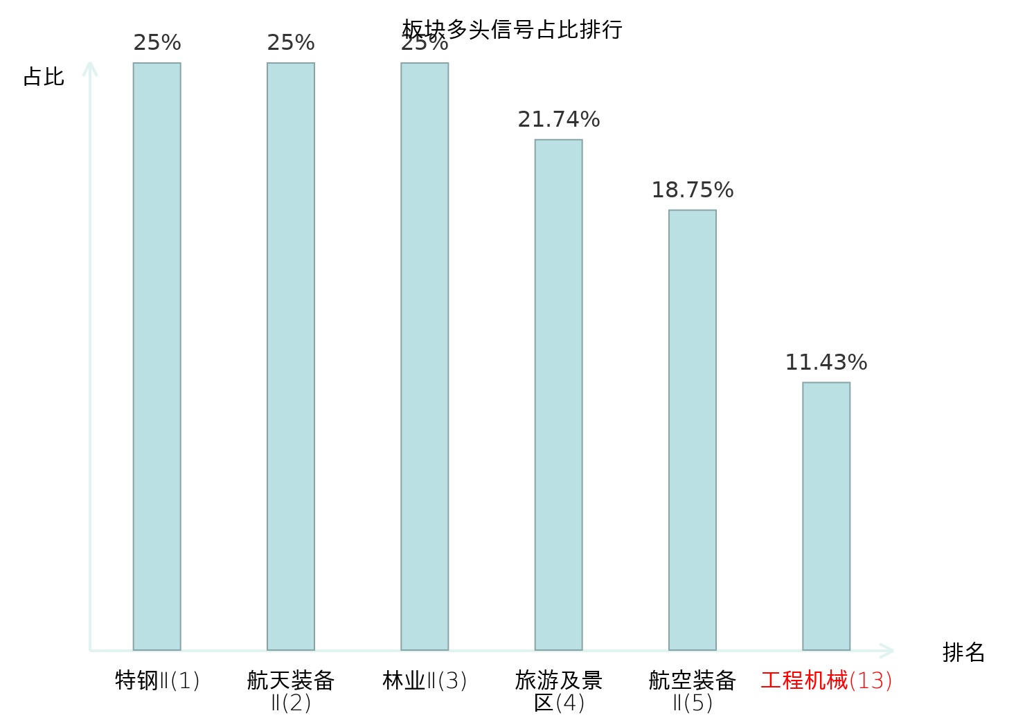 全市场所有行业板块中主力多头信号占比排名中,特钢Ⅱ板块位居第一。林业Ⅱ板块名次提升最快,较昨日上升122位。
