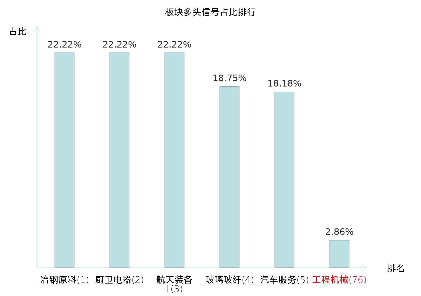 全市场所有行业板块中主力多头信号占比排名中,冶钢原料板块位居第一。航天装备Ⅱ板块名次提升最快,较昨日上升116位。