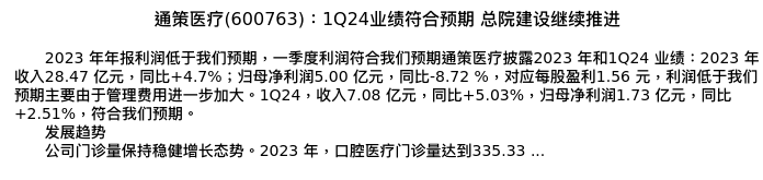 值得注意的是:2024年04月中金公司的朱言音/全芳/张琎分析师,首次发布关于通策医疗的研究报告,标题为:通策医疗(600763):1Q24业绩符合预期 总院建设继续推进。