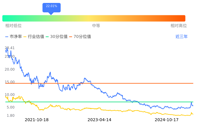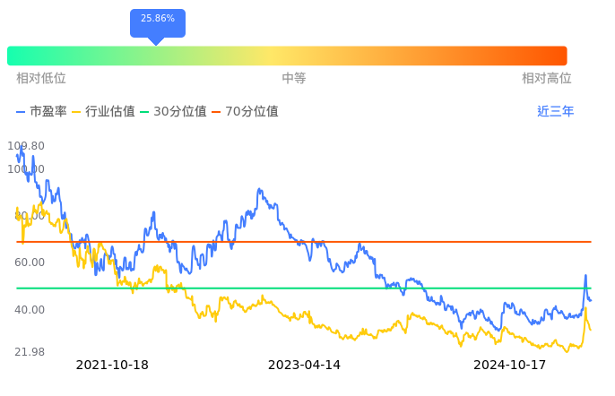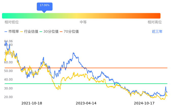 2024年10月17日,通策医疗下跌1.26%收于49.35,今日成交金额4.82亿。下文将从市盈率PETTM、市净率PB、市现率3个角度去分析公司估值情况。