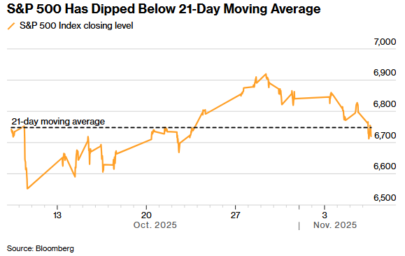智通财经APP获悉,最近,美国股市剧烈波动,交易员们正在研究技术图表,寻找最新一轮抛售可能在何处止步的线索。由于市场对数十亿美元人工智能投资能否带来回报存在疑虑,加上股票估值仍然过高,标普500指数周四跌至6720点,创两周以来新低。技术分析人士表示,从目前水平来看,6665点的50日移动均线将成为重要的支撑位。