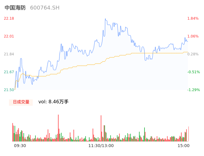 04月26日,中国海防收报21.99,股价涨幅0.96%,成交金额1.85亿元,换手率1.19%。
