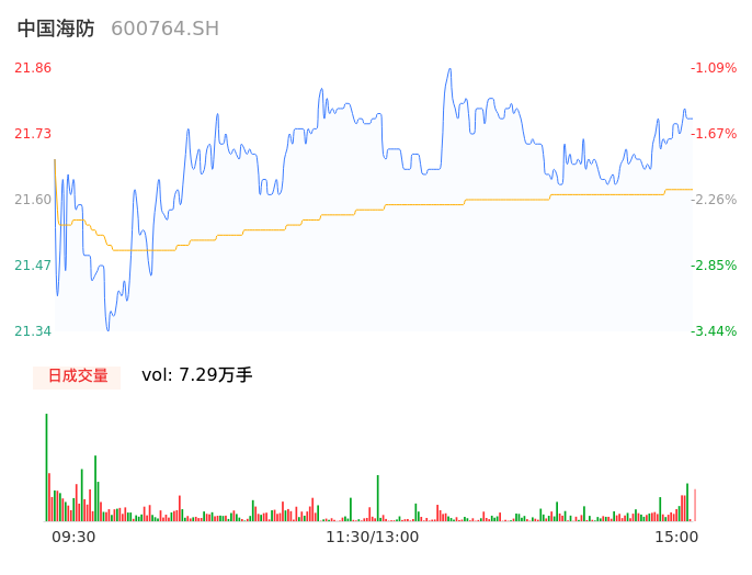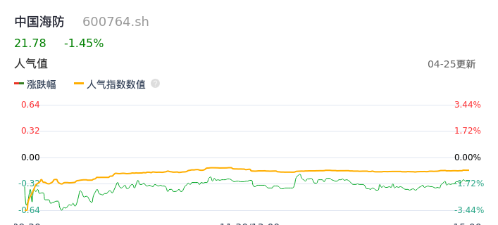 04月25日,中国海防收报21.78,股价涨幅-1.45%,成交金额1.58亿元,换手率1.03%。