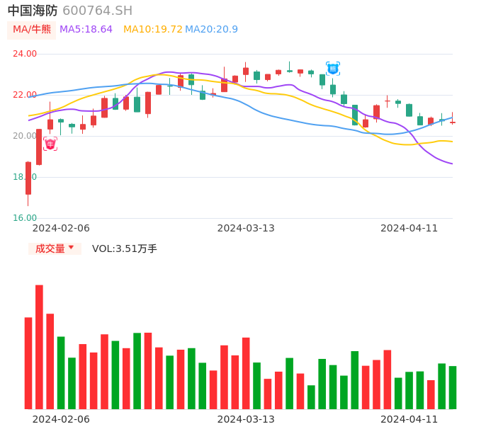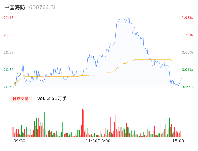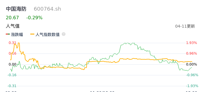 04月11日,中国海防收报20.67,股价涨幅-0.29%,成交金额7300.03万元,换手率0.49%。