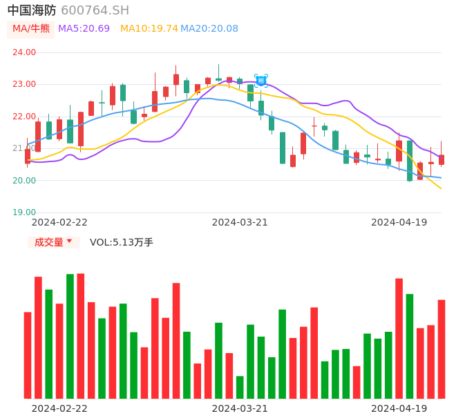 04月19日,中国海防收报20.79,股价涨幅1.07%,成交金额1.07亿元,换手率0.72%。