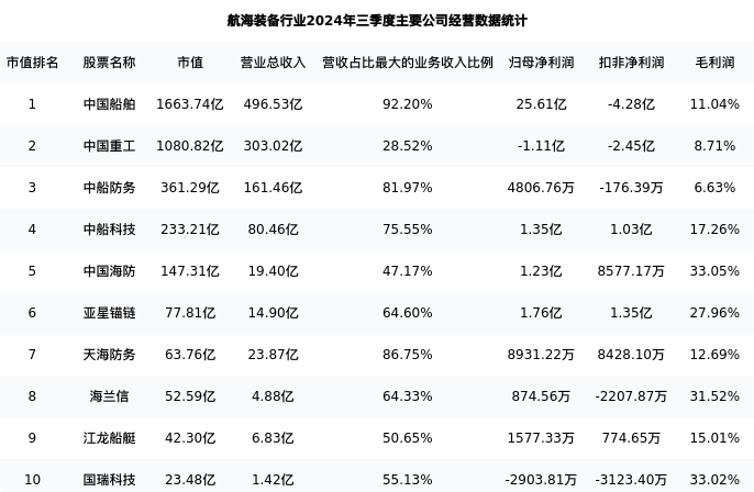 中国海防最新报告期数据为三季度,下表汇总了航海装备行业内市值靠前的公司三季度主要经营数据