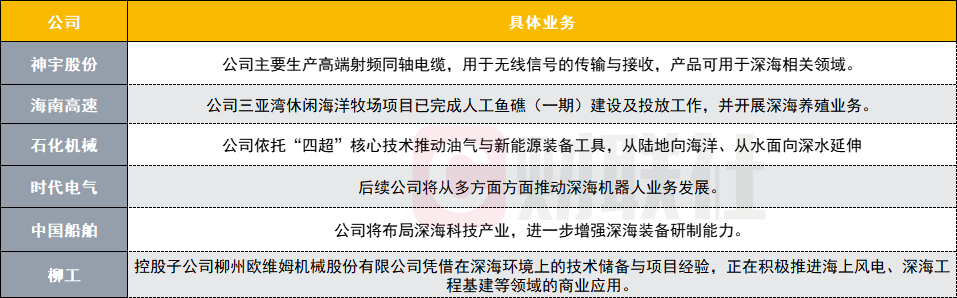 同时,有不少上市公司披露称,公司正在积极布局,进行深海技术储备及相关规划,涉及深海资源开发、深海智能装备、深海信息化等方向。