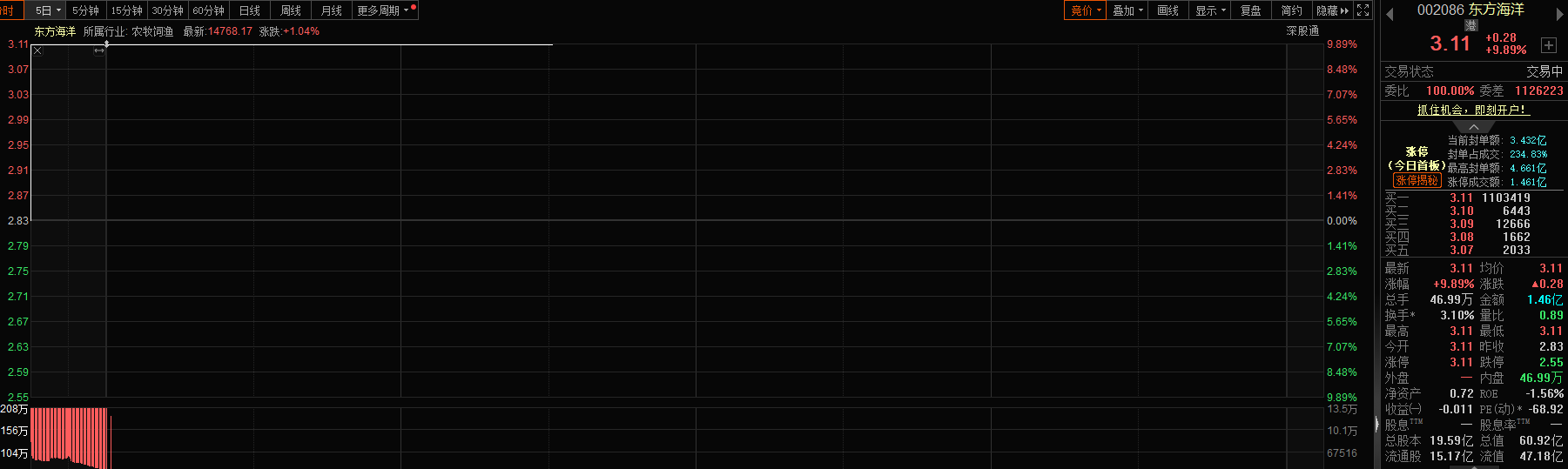 今日深海科技概念股逆市走强,截至发稿,东方海洋一字涨停,天海防务飙升逾6%,中国海防涨超4%,中船防务、中国动力等纷纷上涨。
