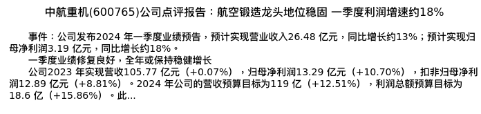 值得注意的是:2024年04月方正证券的李鲁靖/刘明洋分析师,首次发布关于中航重机的研究报告,标题为:中航重机(600765)公司点评报告:航空锻造龙头地位稳固 一季度利润增速约18%。