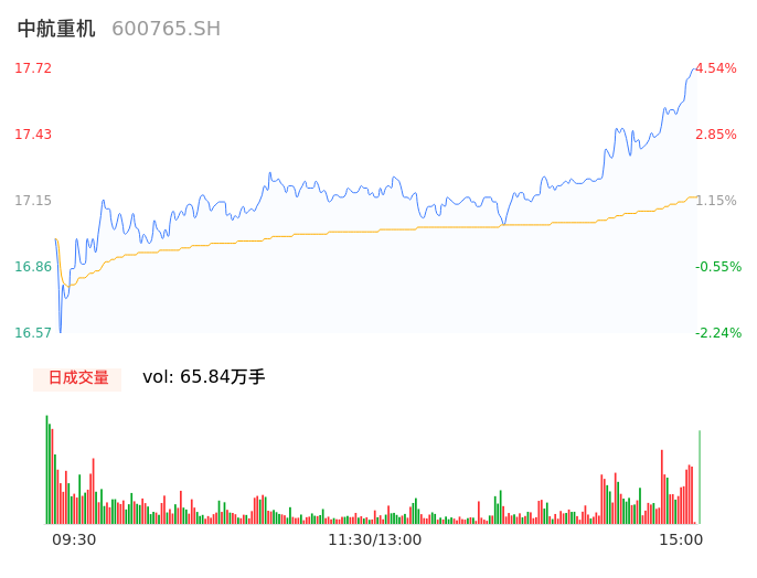 04月17日,中航重机收报17.71,股价涨幅4.48%,成交金额11.31亿元,换手率4.48%。