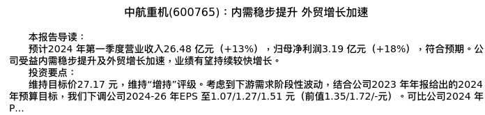 值得注意的是:2024年04月国泰君安的彭磊/周明頔分析师,首次发布关于中航重机的研究报告,标题为:中航重机(600765):内需稳步提升 外贸增长加速。