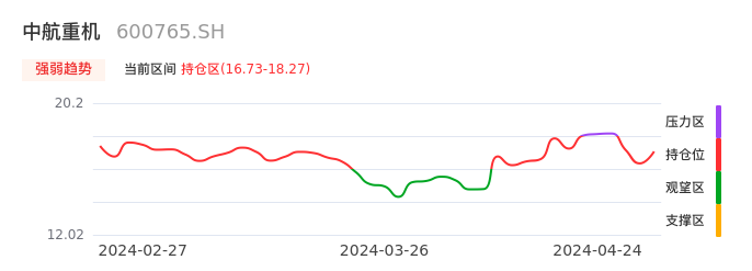 我们来看一下该股的九方特色指标强弱趋势的情况:中航重机近日从压力区回到持仓区。股价快速拉升后出现持续调整,目前出现启稳回暖态势。后续重点关注上方压力位:18.27元是否能再次上攻。