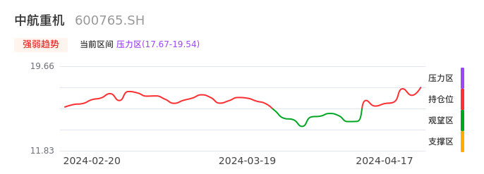 我们来看一下该股的九方特色指标强弱趋势的情况:中航重机近日从持仓区进入压力区。股价出现一波快速拉升行情,目前上升动能较为充足可继续持股。注意今日上方压力位:19.54元是否能有效突破。