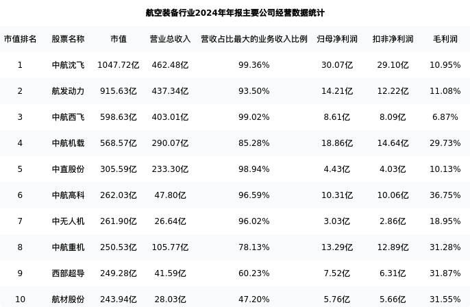 中航重机最新报告期数据为年报,下表汇总了航空装备行业内市值靠前的公司年报主要经营数据