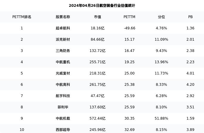 从估值角度看:中航重机最新市盈率PETTM为19.25,在行业内排名3/44,处于13.96分位。