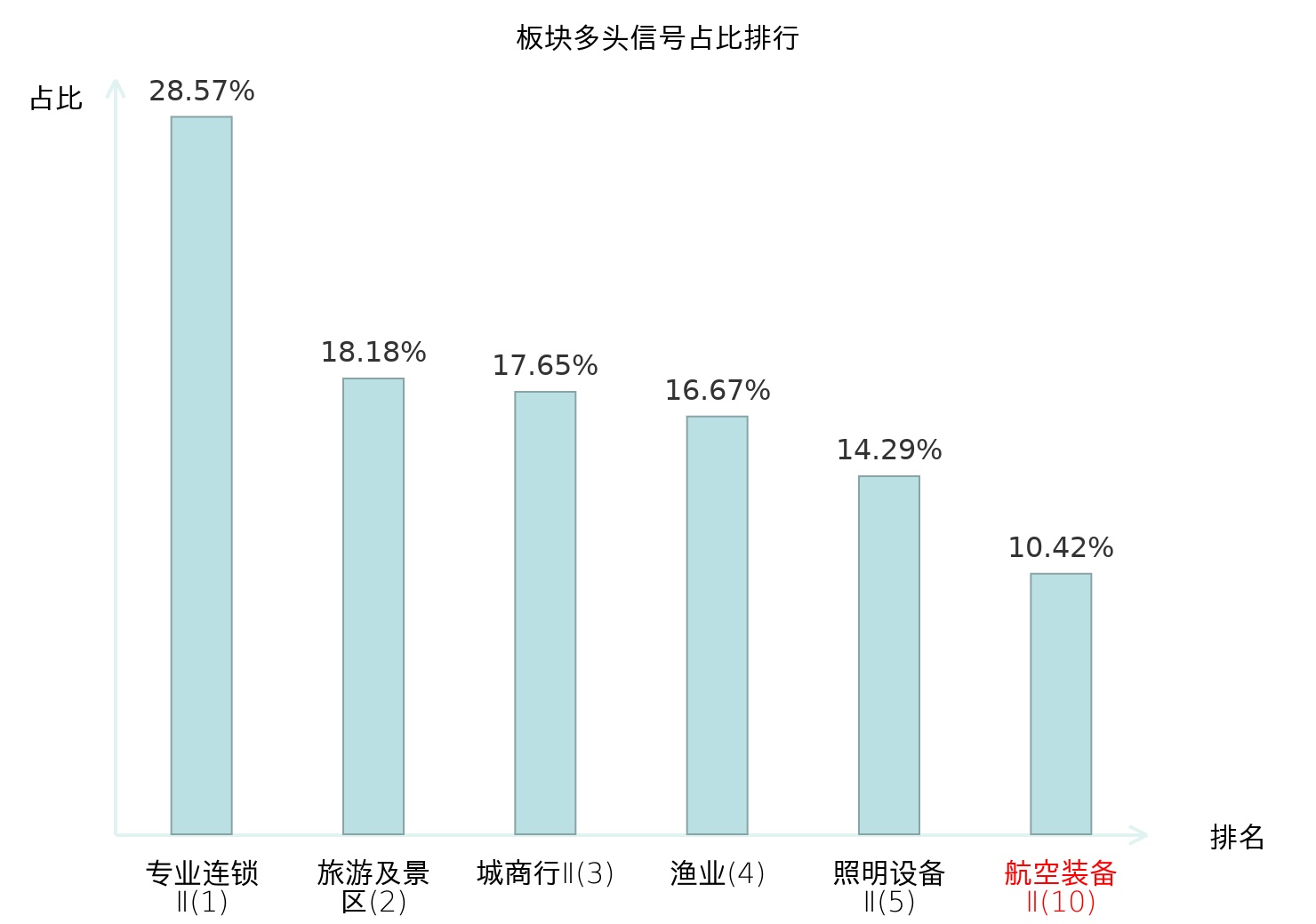 全市场所有行业板块中主力多头信号占比排名中,专业连锁Ⅱ板块位居第一。专业连锁Ⅱ板块名次提升最快,较昨日上升120位。
