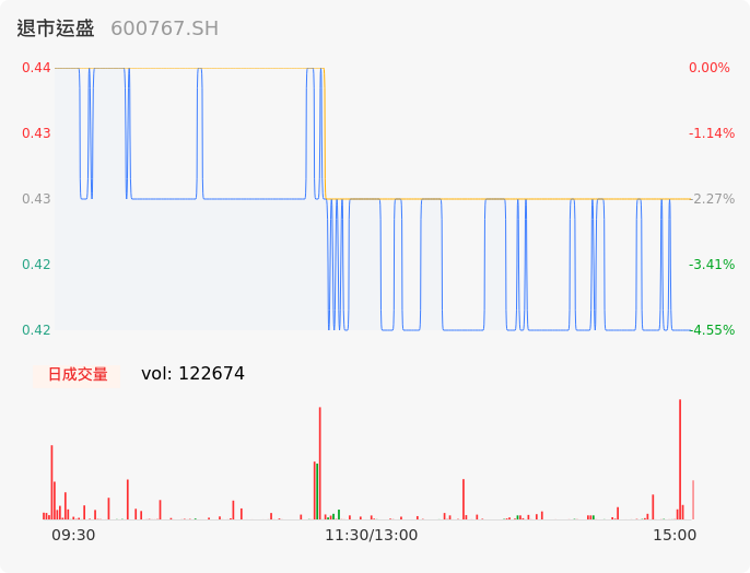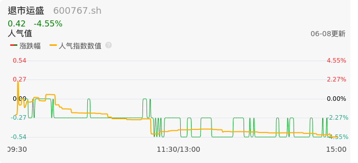 06月08日,退市运盛收报0.42,股价涨幅-4.55%,成交金额526.13万元,换手率3.60%。