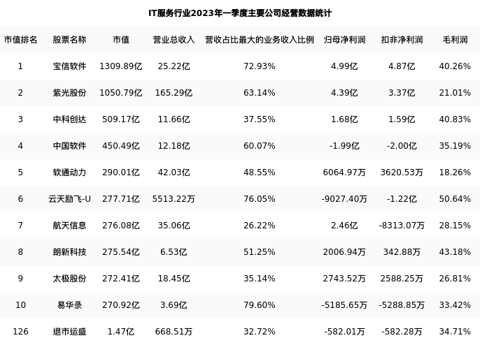 退市运盛最新报告期数据为一季度,下表汇总了IT服务行业内市值靠前的公司一季度主要经营数据