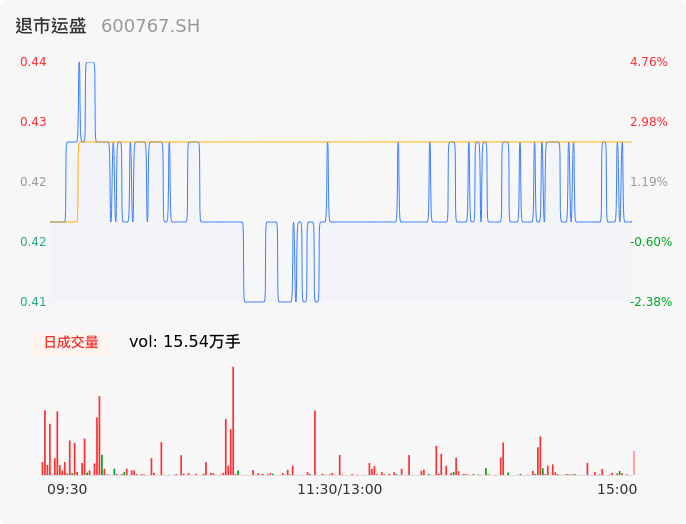 06月19日,退市运盛收报0.43,股价涨幅2.38%,成交金额661.50万元,换手率4.56%。