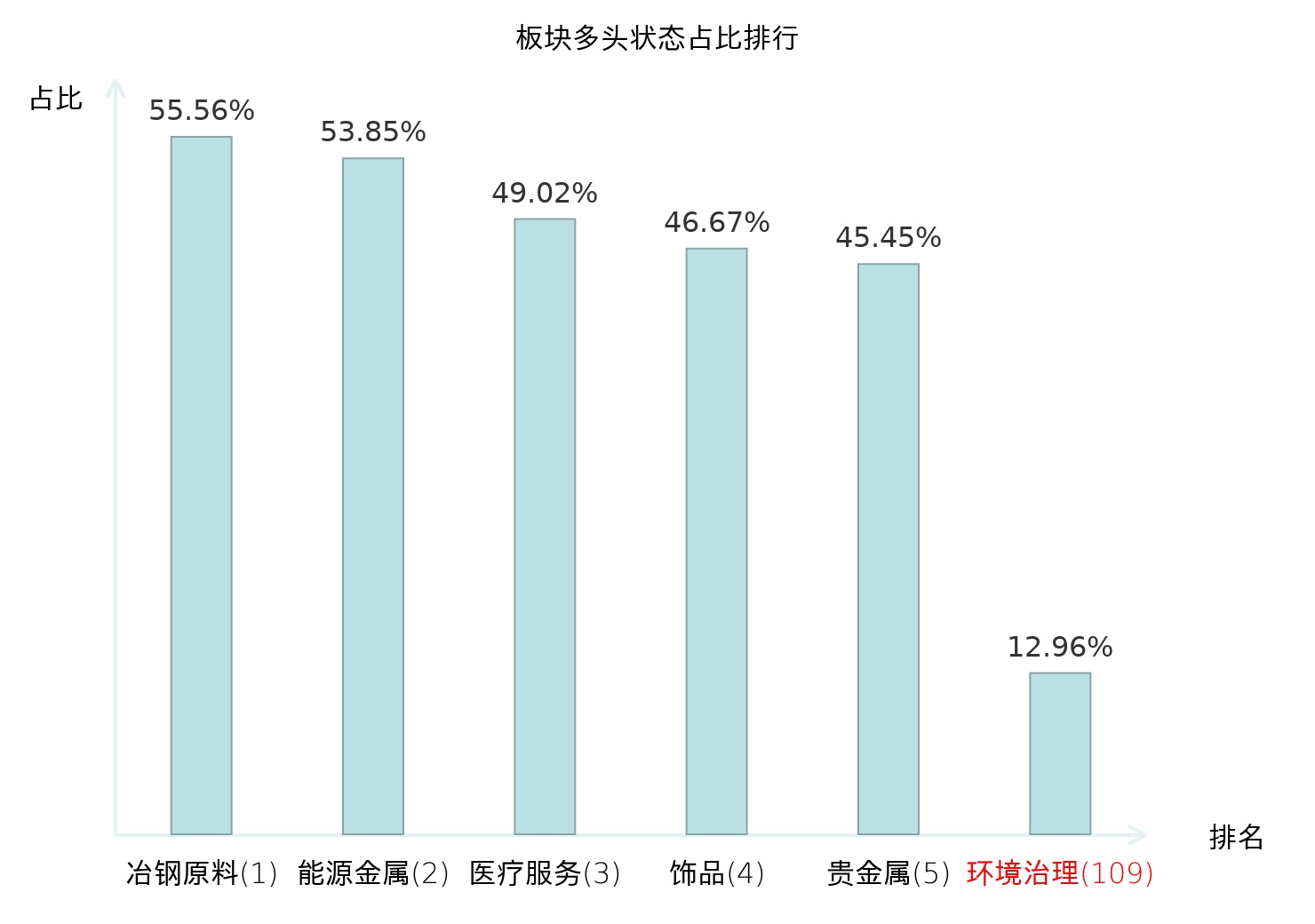 全市场所有行业板块中主力多头状态占比排名中,冶钢原料板块位居第一。能源金属板块名次提升最快,较昨日上升89位。