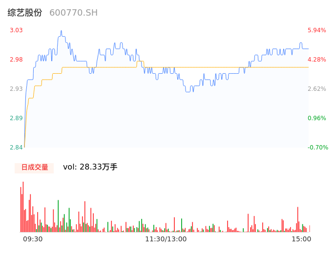 04月17日,综艺股份收报3.00,股价涨幅4.90%,成交金额8424.50万元,换手率2.18%。