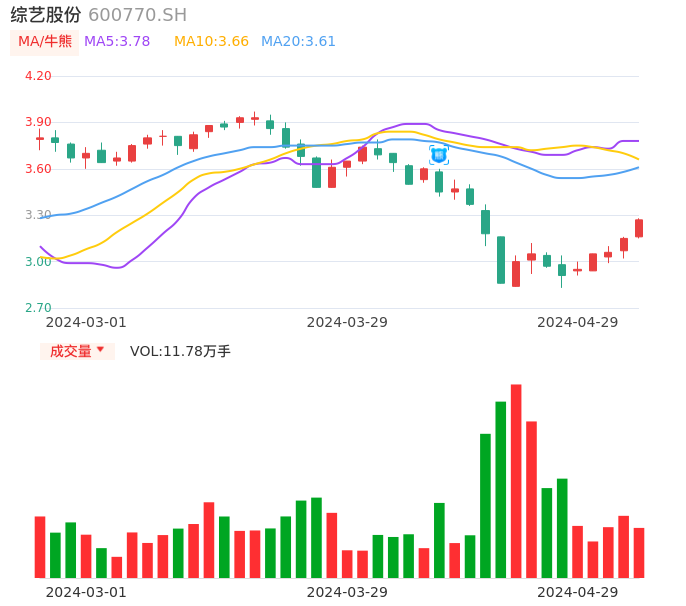 04月29日,综艺股份收报3.27,股价涨幅3.81%,成交金额3807.44万元,换手率0.91%。