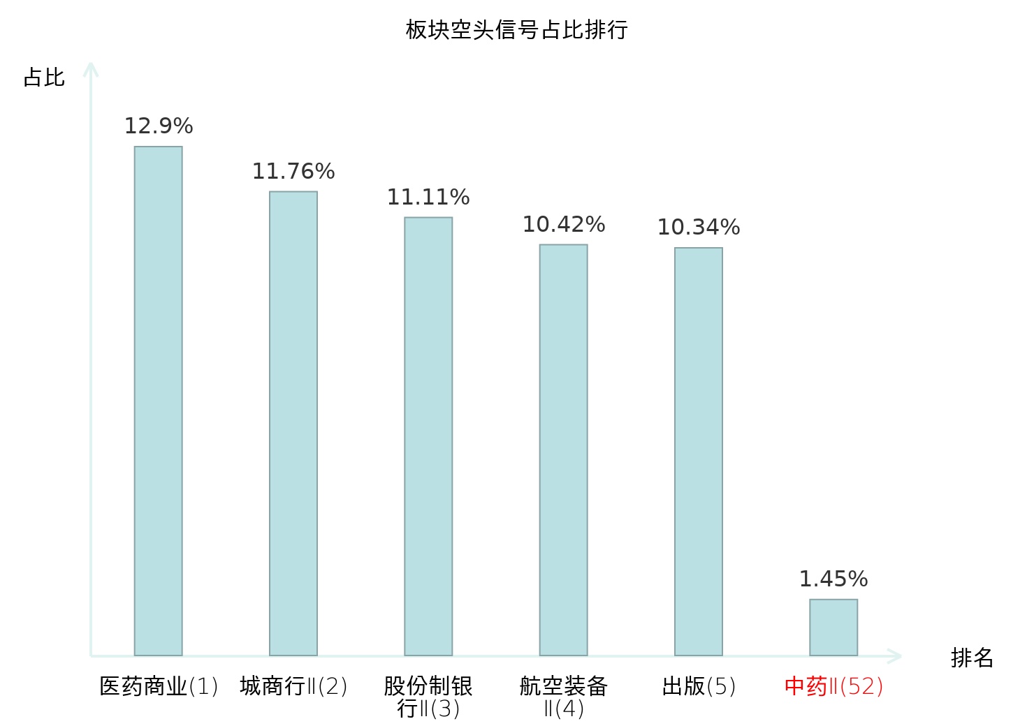 全市场所有行业板块中主力空头信号占比排名中,医药商业板块位居第一。城商行Ⅱ板块名次提升最快,较昨日上升102位。
