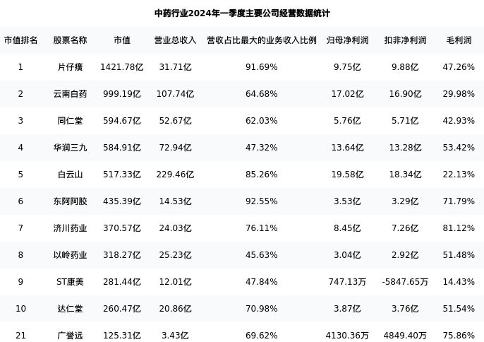 广誉远最新报告期数据为一季度,下表汇总了中药行业内市值靠前的公司一季度主要经营数据
